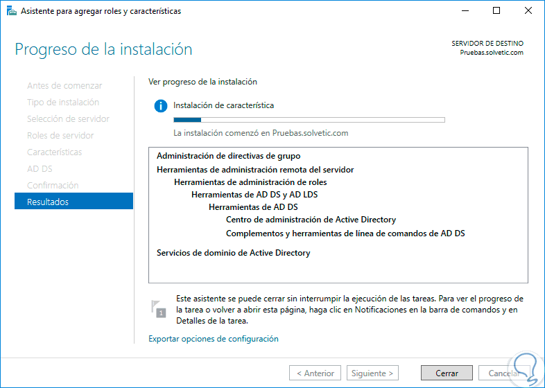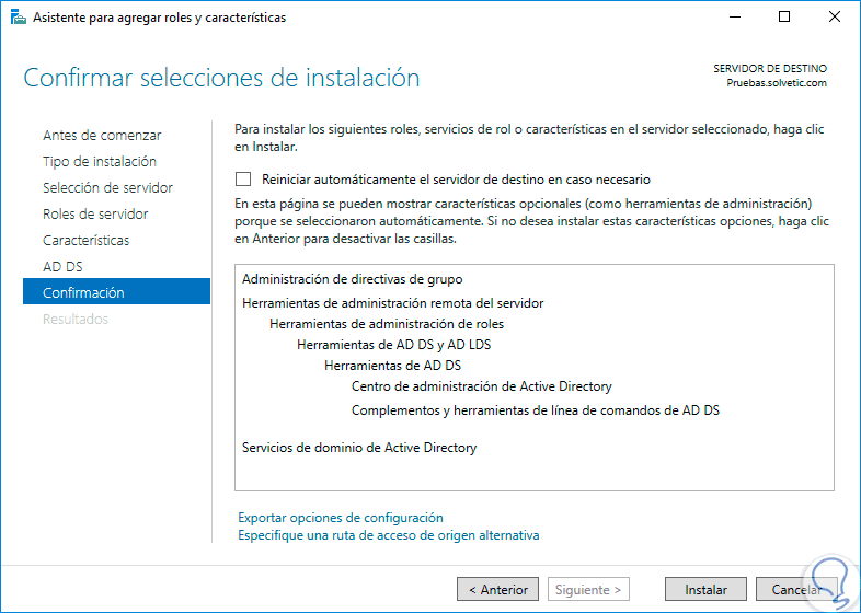 Una vez confirmado pulsamos en el botón Instalar para dar inicio al proceso de instalación del rol de Directorio Activo: