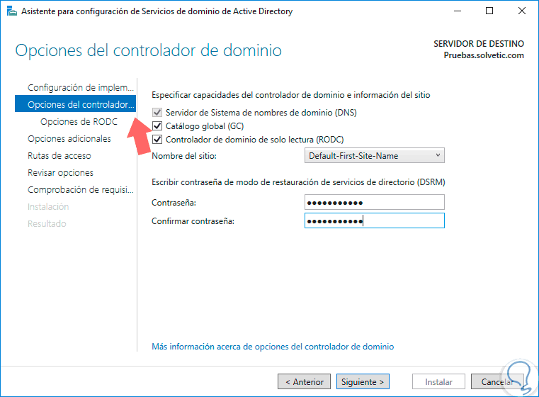 Pulsamos en Aceptar y damos clic en Siguiente y en la próxima ventana será necesario que activemos la casilla Controlador de dominio de solo lectura (RODC) y asignemos la contraseña para el DSRM: