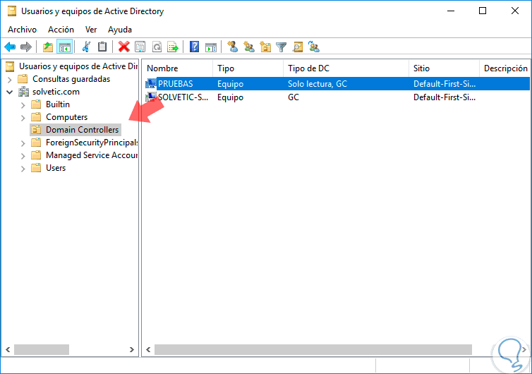 Una vez accedamos a Windows Server 2016 comprobaremos que se ha definido este servidor como RODC de forma correcta, para esto vamos a Usuarios y equipos de Active Directory y en la opción Domain Controllers podremos ver los respectivos controladores de dominio con sus atributos: