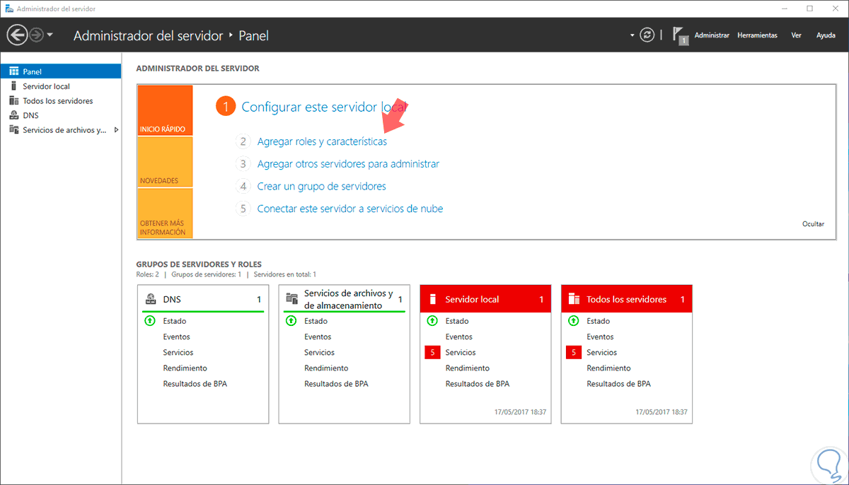 El primer paso consiste en instalar los roles de Directorio Activo en el servidor RODC y para ello seleccionamos la opción Agregar roles y características desde el Administrador del servidor o desde la opción Administrar:
