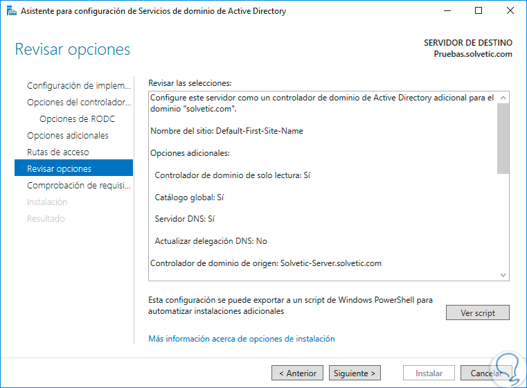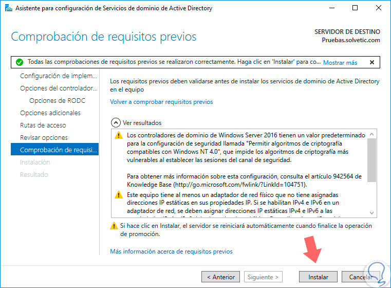 Con todas las comprobaciones correctas pulsamos en Instalar para iniciar la configuración del servidor RODC en Windows Server 2016: