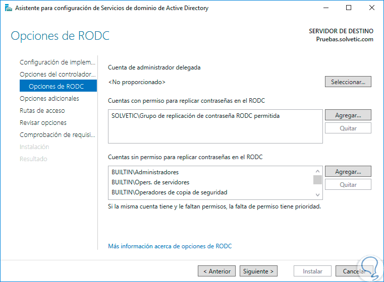 Pulsamos en Siguiente y en la ventana de Opciones de RODC podremos agregar grupos tanto para denegar como para permitir contraseñas en el RODC: