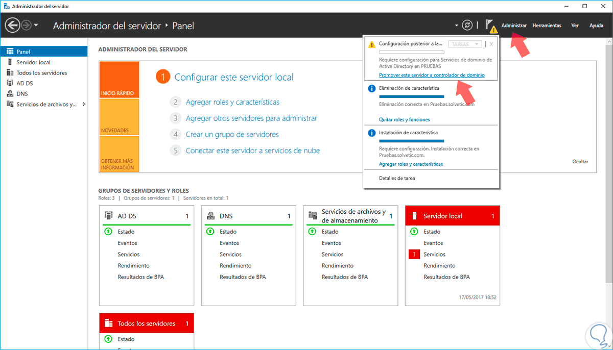 Una vez instalado el rol vamos al Administrador del servidor y allí vemos una advertencia la cual nos indica que este servidor deberá ser promovido como controlador de dominio: