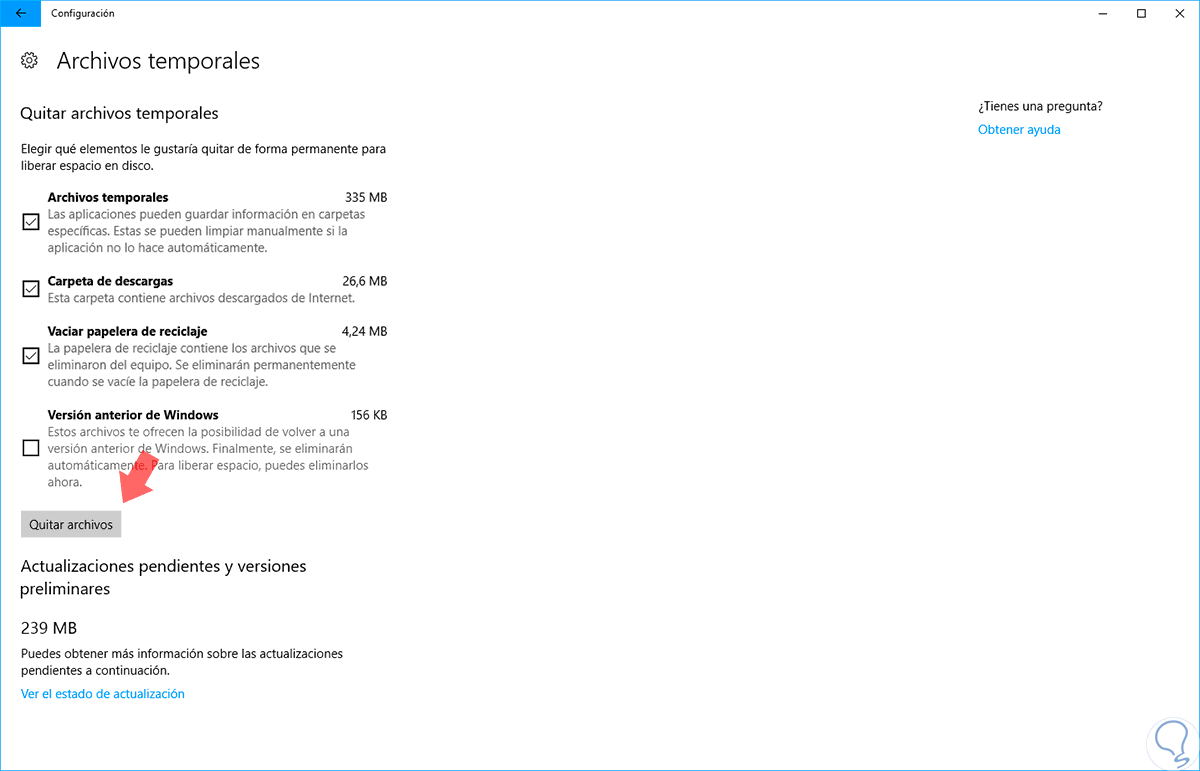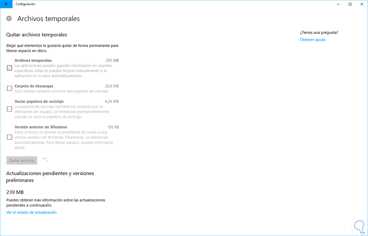 Pulsamos sobre la opción "Quitar archivos" y de esta forma Windows 10 borrará dichos archivos del sistema: