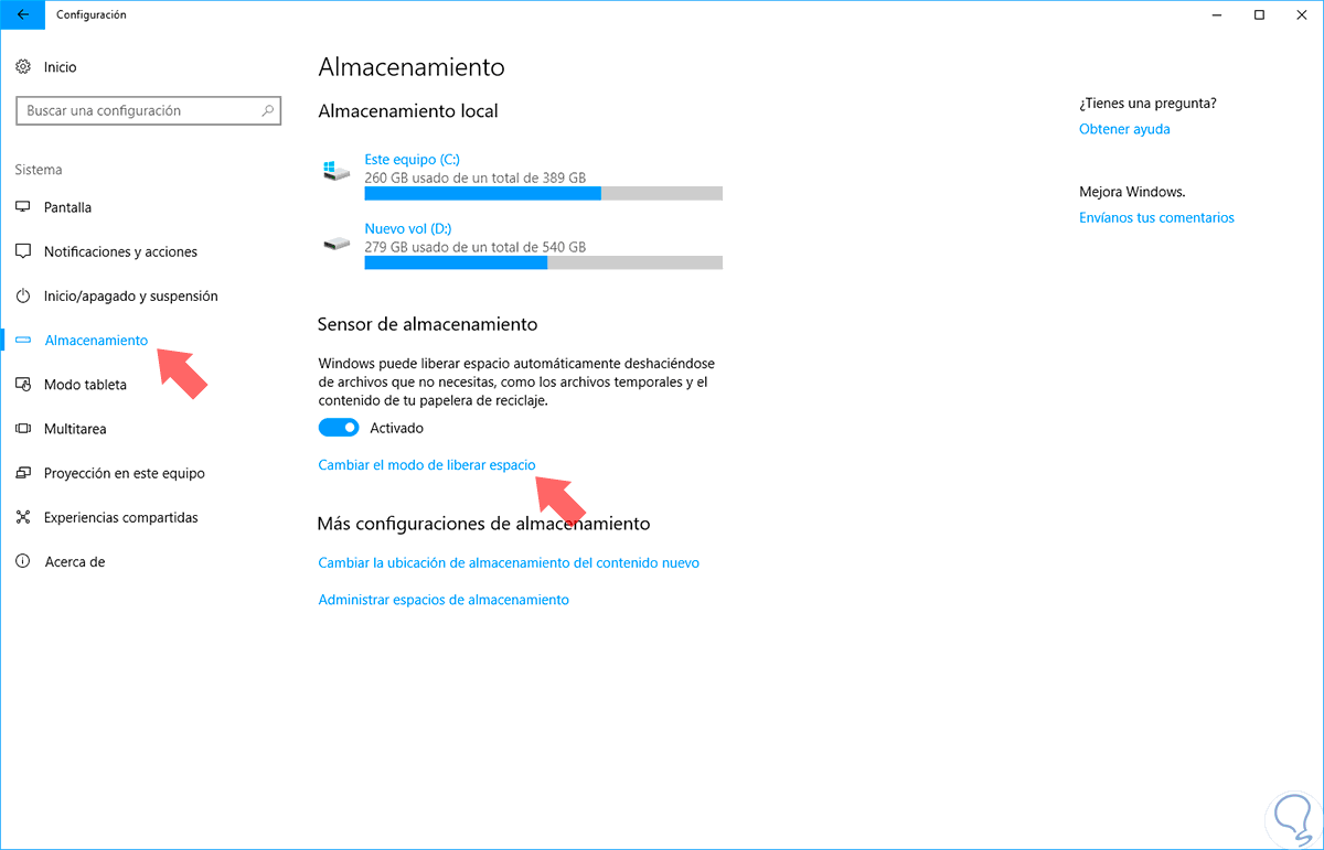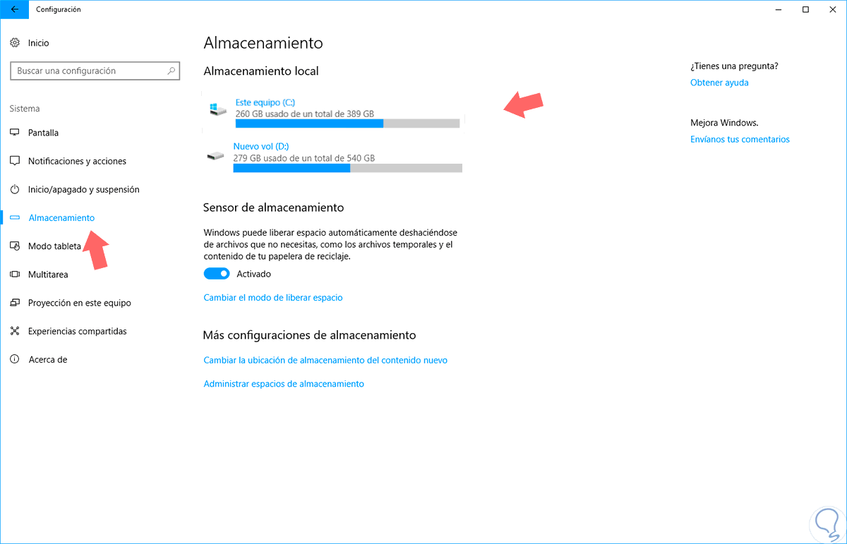 Accedemos a la ruta Inicio / Configuración / Sistema / Almacenamiento, veremos lo siguiente: