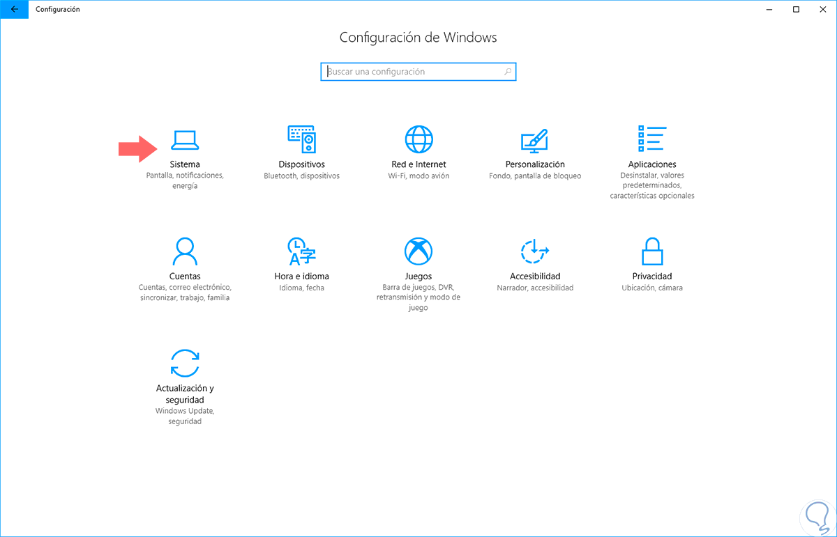 Desde la build 16199 llamada Falls Creators Update de Windows 10 se ha incorporado una nueva función llamada "Sensor de almacenamiento" mediante el cual tendremos la oportunidad de gestionar todos los valores de almacenamiento en el sistema operativo. Para acceder a esta funcionalidad vamos al menú "Inicio" y allí pulsamos en la opción "Configuración", veremos lo siguiente: