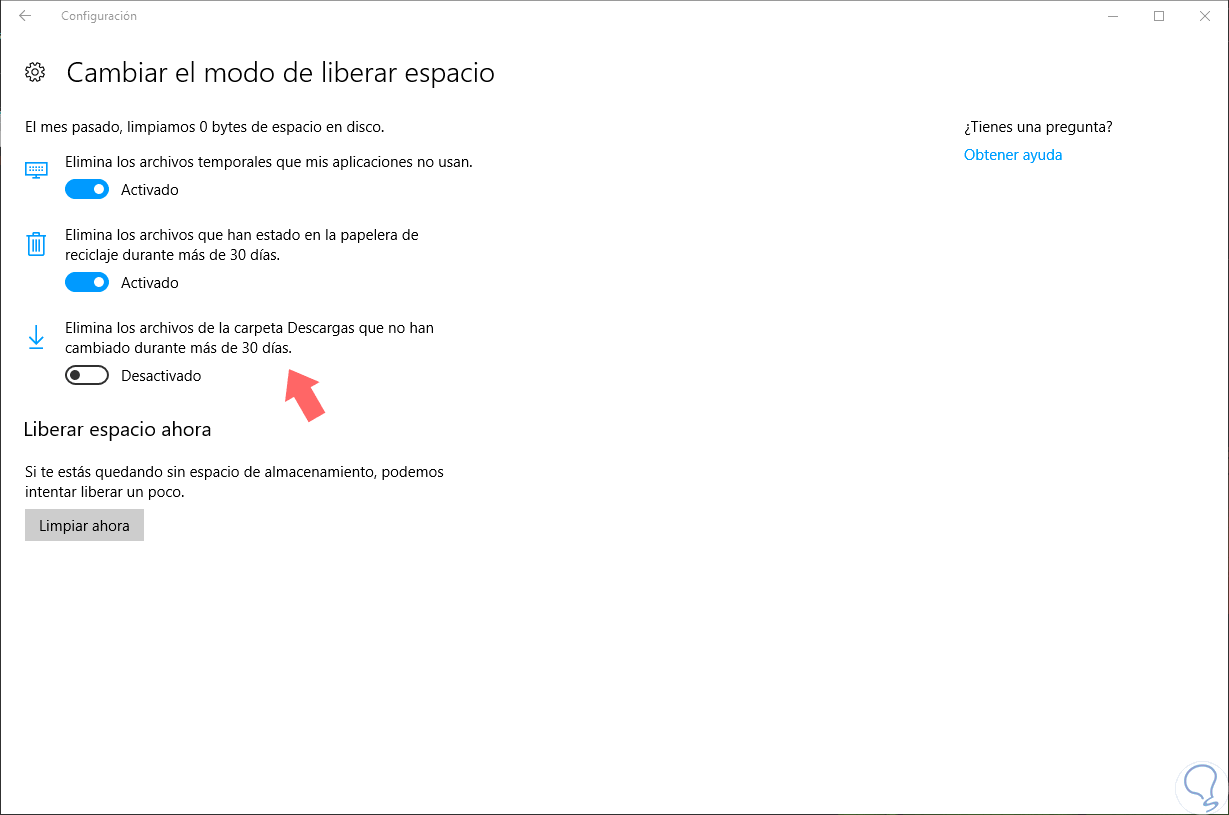 Allí podremos activar el interruptor de la opción "Elimina los archivos de la carpeta Descargas que no han cambiado en más de 30 días" para que su estado pase a ser activo.