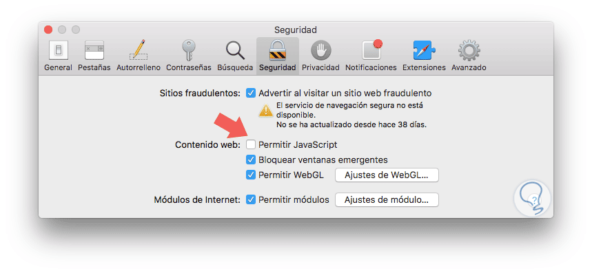 Para deshabilitar Java en Safari vamos al menú Safari / Preferencias y en la pestaña Seguridad desactivamos la casilla Permitir JavaScript