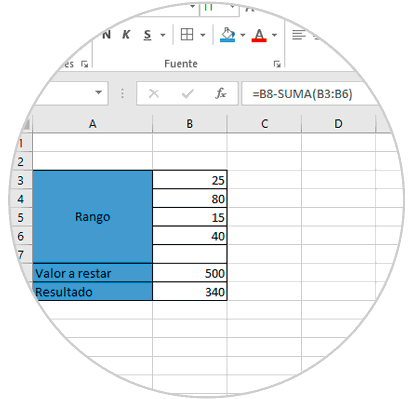 Para esto en Excel 2016 podremos realizar la operación de resta añadiendo la función SUMA para obtener un resultado preciso y confiable.