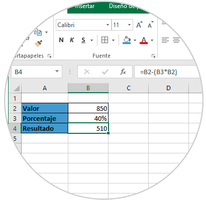 El proceso es sencillo y para ello en primer lugar definimos el numero al cual se le restara el porcentaje (Celda B2), posteriormente definiremos el porcentaje a restar (Celda B3) y el resultado lo obtendremos usando la siguiente fórmula: