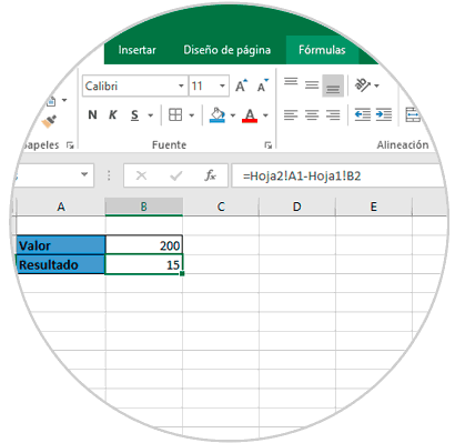 Para esto tenemos en la Hoja 1 en la celda B2 un dato y en la Hoja 2 en la cela A1 otro valor, el objetivo es restar ambos valores, para ello ingresamos el signo igual (=), vamos a la Hoja 2 y damos clic en la celda respectiva, luego usamos el símbolo – y retornamos a la Hoja 1 y damos clic en el valor a restar, de modo que la sintaxis queda de la siguiente manera: