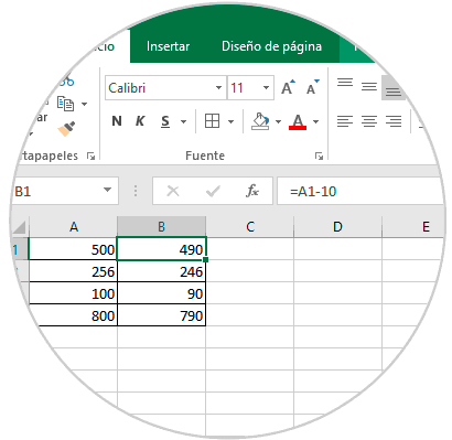 Por ejemplo, si deseamos restar 10 a un numero de celdas será necesario ingresar en la celda deseada, en este caso la celda B1 lo siguiente: