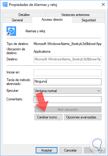 Este proceso aplica para la mayoría de aplicaciones modernas de Windows 10. Se desplegará la siguiente ventana donde iremos a la pestaña Acceso directo. Allí pulsamos en la opción Cambiar icono y seguiremos los pasos arriba mencionados para modificar el icono de la aplicación.