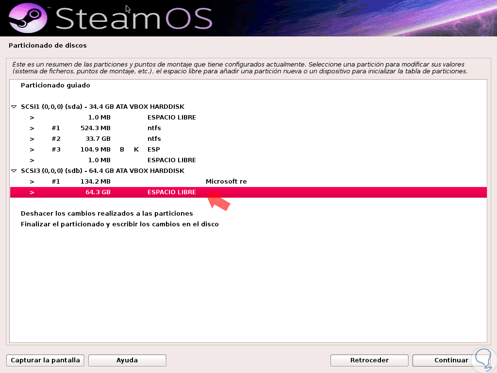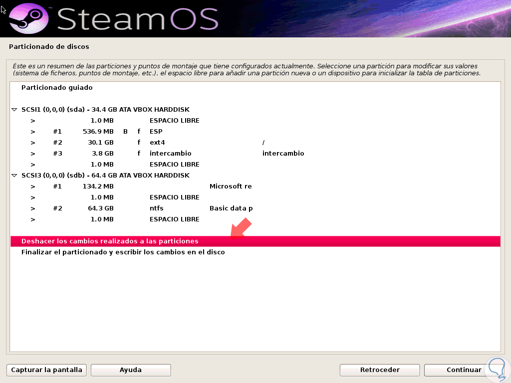 Allí elegimos la opción Deshacer los cambios realizados a las particiones, pulsamos en Continuar y en la siguiente ventana seleccionaremos la unidad donde se ha de instalar SteamOS la cual incluye la leyenda Espacio libre: