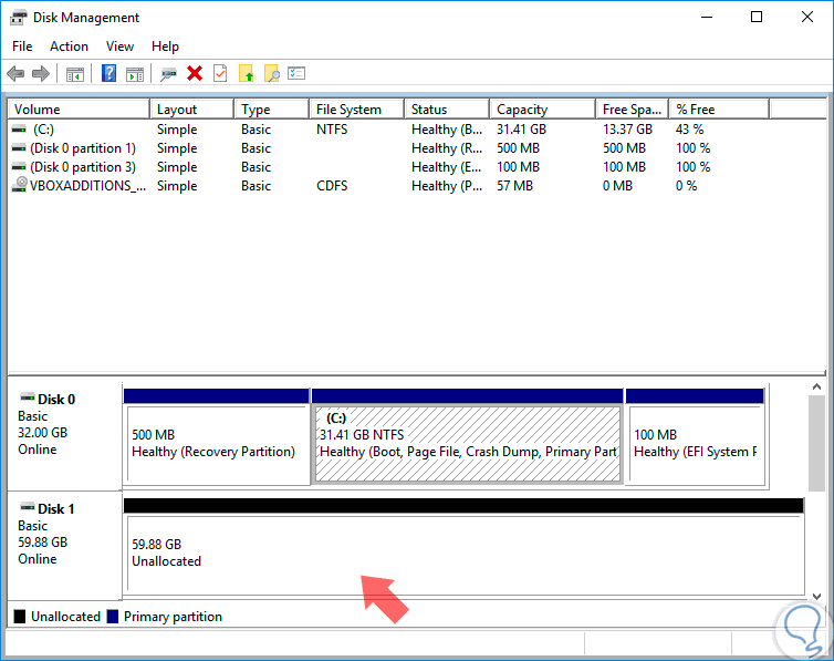 Como se trata de un arranque dual será necesario que creemos una nueva partición en el disco duro de Windows 10 al menos de 50 GB de espacio libre, en este caso hemos añadido un disco de 60 GB.