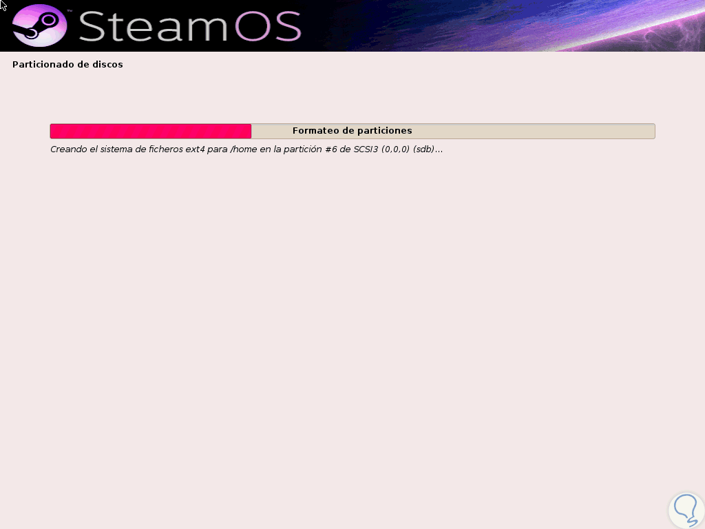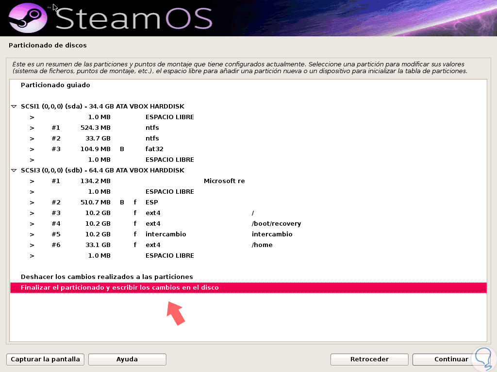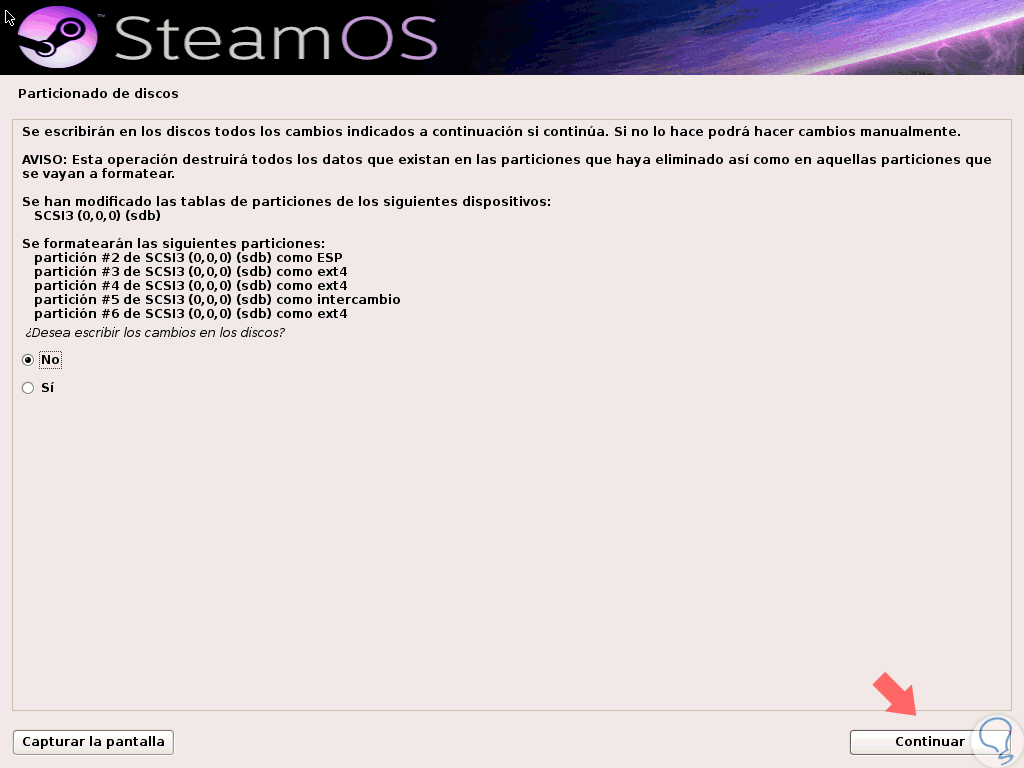 Activamos la casilla Si para escribir los cambios en el disco y pulsamos en Continuar. Iniciará el proceso de instalación de SteamOS en la partición de Windows 10: