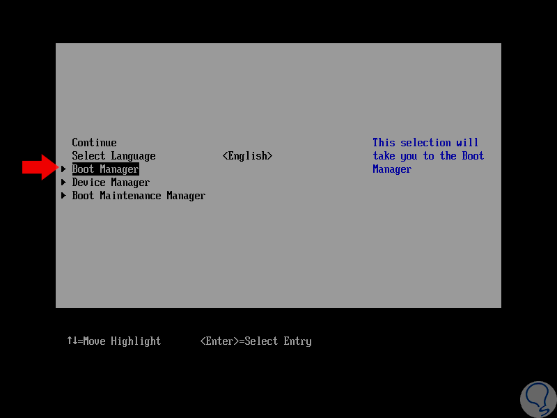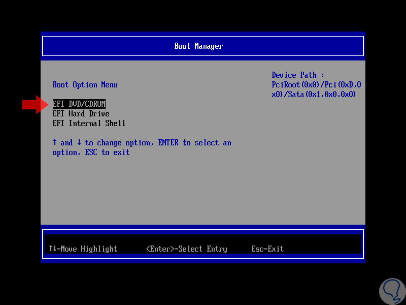Ali seleccionamos la opción Boot Manager para gestionar el arranque del equipo, se desplegará lo siguiente. En este caso la imagen ISO de SteamOS la hemos grabado en un DVD por lo cual seleccionamos la opción EFI DVD/CDROM, en caso de ser USB seleccionaremos la opción adecuada.