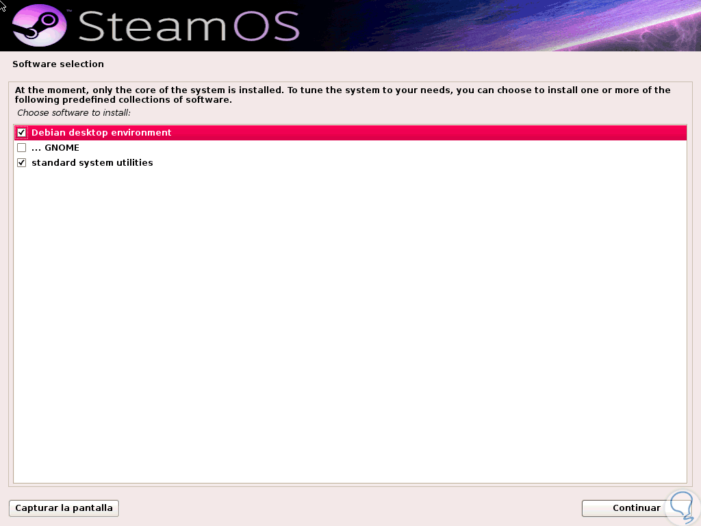Si deseamos activar un entorno GNOME seleccionamos la respectiva casilla y pulsamos en Continuar.