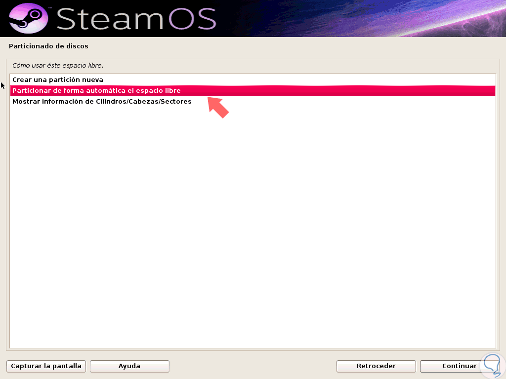 Al pulsar en Continuar se desplegarán las siguientes opciones donde seleccionamos la opción Particionar de forma automática el espacio libre: