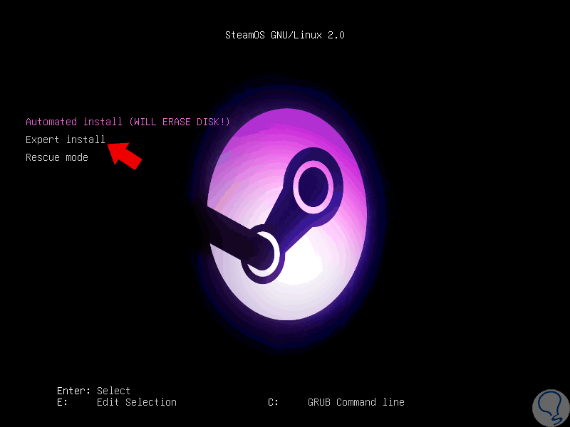 Una vez configurado el arranque desde el medio donde está la imagen ISO de SteamOS esta será la primer ventana que observemos. Allí seleccionamos la línea Expert install.