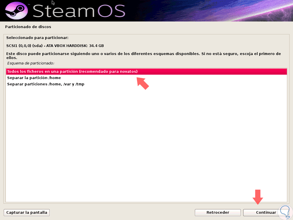 Allí seleccionamos la opción por defecto y pulsamos en Continuar. A continuación debemos definir el tipo de particionado de los discos, se desplegará lo siguiente: