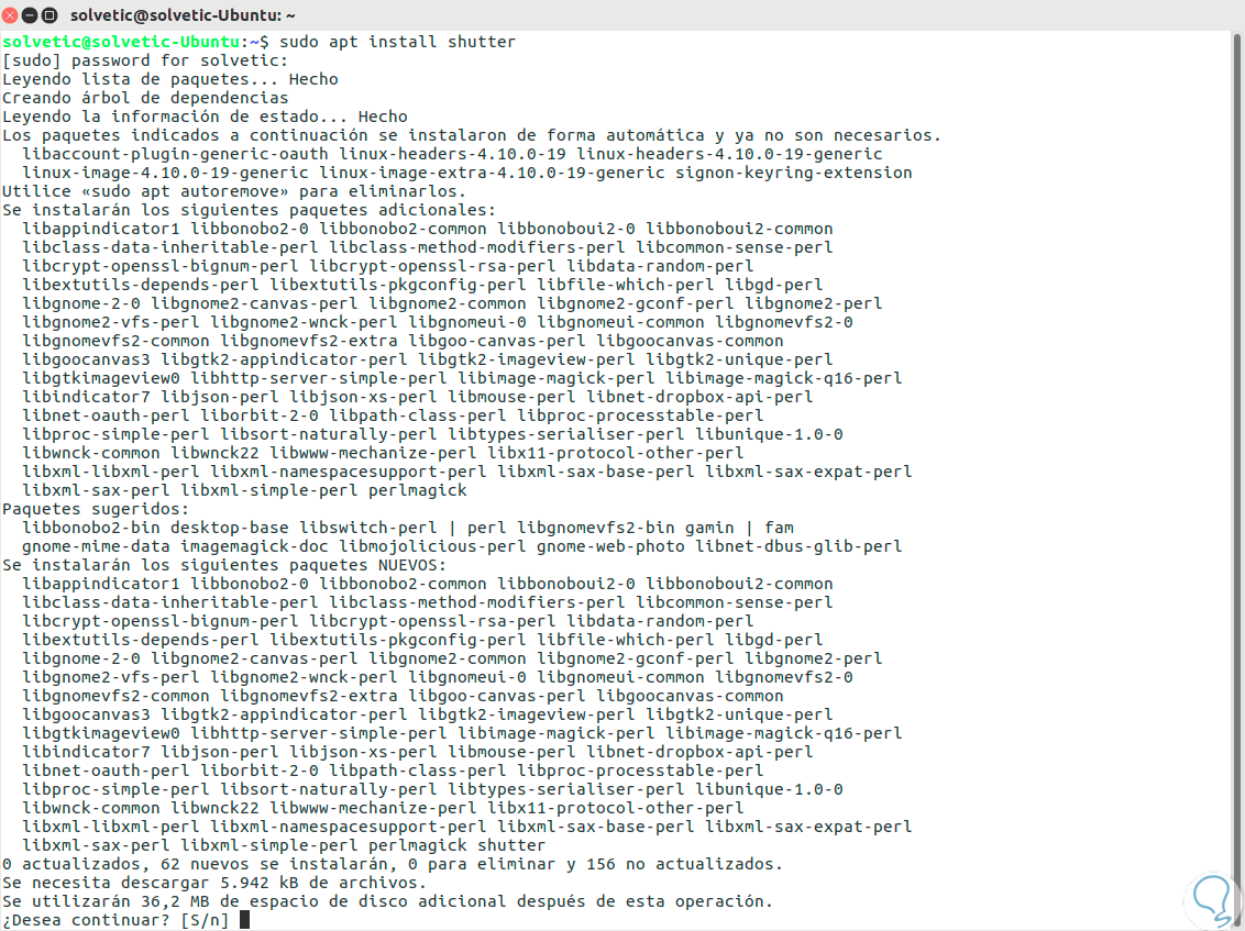 Para instalar Shutter en Ubuntu 17.04 ejecutaremos el siguiente comando. Allí ingresamos la letra S para aceptar la descarga de los paquetes y su respectiva instalación.