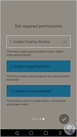 Allí pulsamos en la flecha inferior para continuar y será necesario aceptar y permitir tres permisos:
