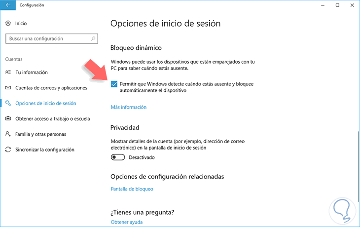 Allí ubicamos el campo Bloqueo dinámico y activamos la casilla “Permitir que Windows detecte cuando estas ausente y bloquee automáticamente el dispositivo”. Con esto hemos habilitado el Bloqueo dinámico en Windows 10 de modo que cuando nos ausentemos el equipo será bloqueado de forma automática: