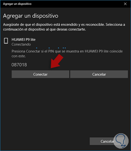 Windows 10 reconocerá el nombre del móvil e indicará que validemos el código desplegado en el móvil, esto veremos en nuestro teléfono: