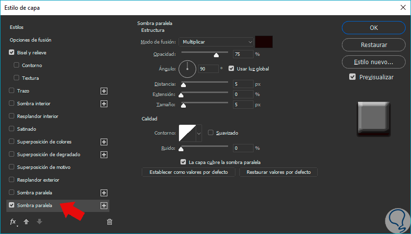 Introduce los valores que ves a continuación en Sombra paralela.