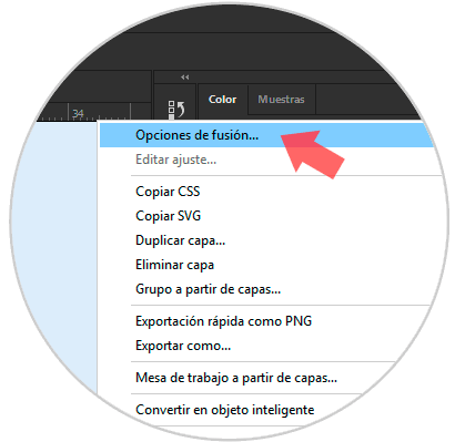 Dentro de la capa de la forma creada hacemos clic sobre ella y seleccionamos Opciones de fusión.