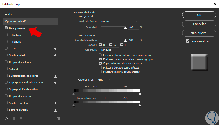 Ahora introducimos unos valores similares a los que estás viendo en la imagen. Primero en el efecto de Bisel y relieve.