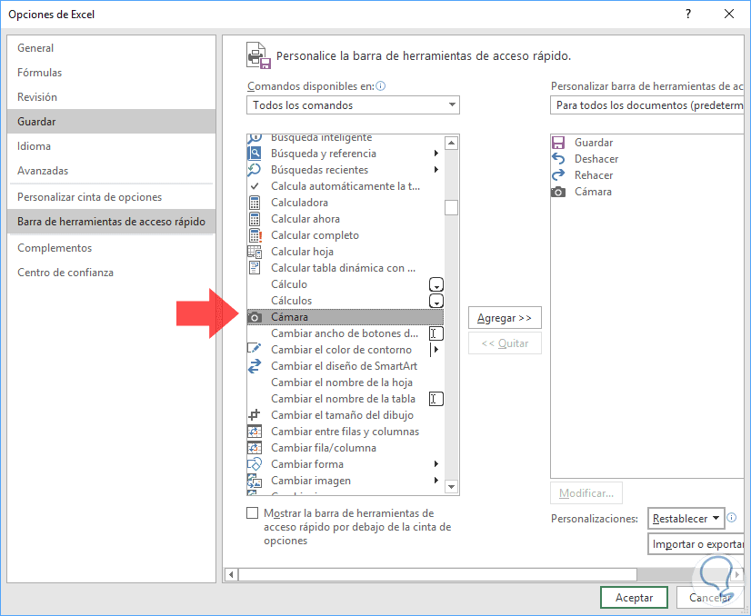 En la nueva ventana seleccionaremos la opción Todos los comandos en el campo Comandos disponibles en y en la lista de comandos seleccionamos Cámara y pulsamos en el botón Agregar: