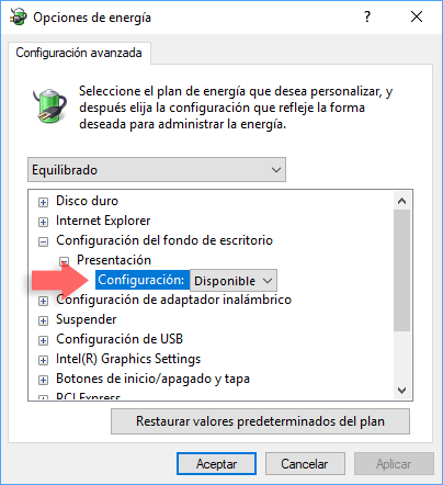 Allí seleccionamos la opción Cambiar la configuración avanzada de energía y en la línea Configuración del fondo de escritorio seleccionamos Presentación / Batería y establecemos el estado en Disponible.