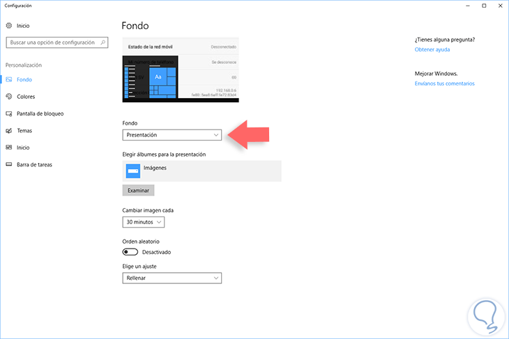 Para ello vamos nuevamente a la opción Personalización como se ha descrito anteriormente y esta vez seleccionaremos la opción Presentación en el campo Fondo: