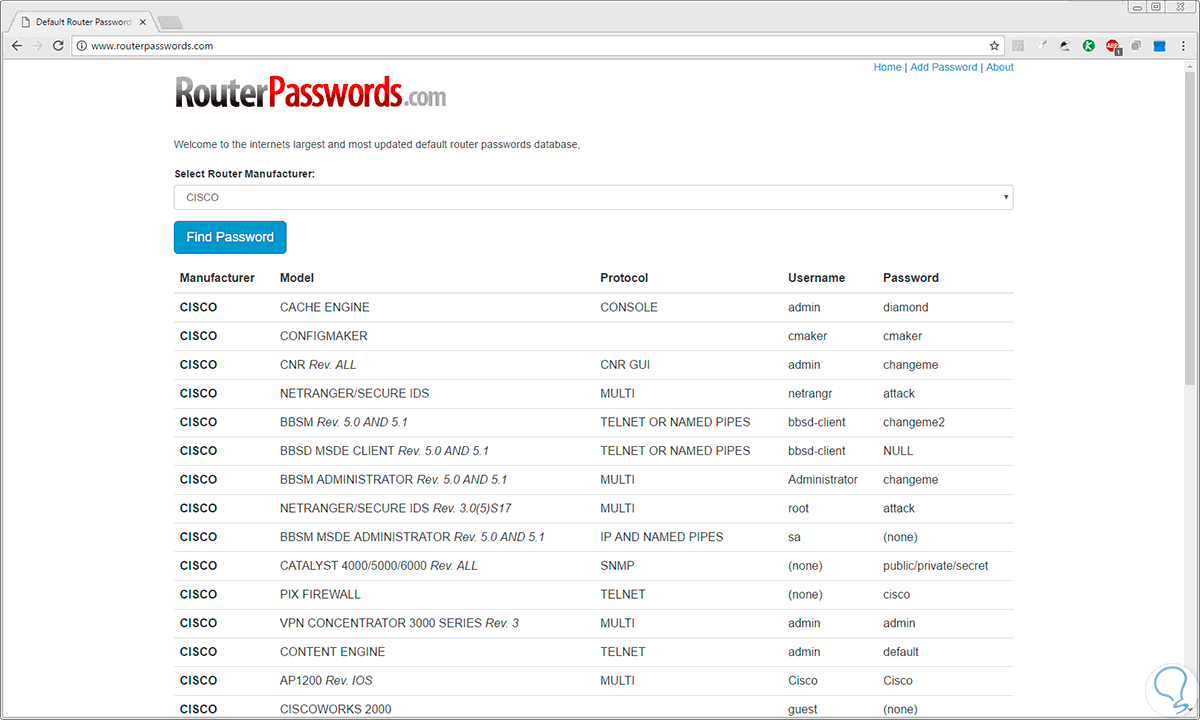 Cada router trae consigo un usuario y contraseña predefinida, si deseamos consultar cual es el usuario y contraseña de los diversos routers podremos ir al siguiente enlace: