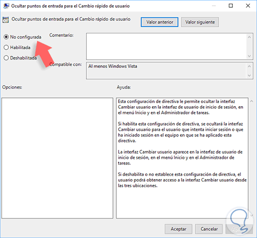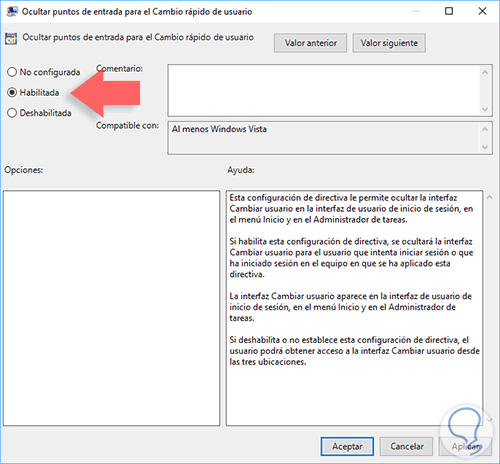 Podemos ver que por defecto está en el valor No configurada lo cual permitirá que usemos el cambio rápido de usuario. Allí será necesario que activemos la casilla Habilitada para prevenir que tengamos la posibilidad de realizar el cambio rápido: