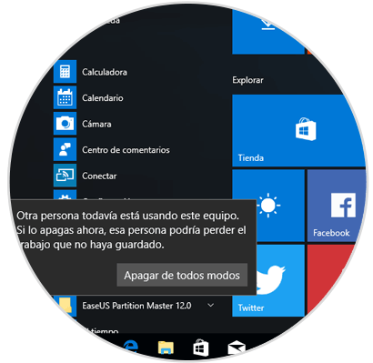 En este ejemplo hemos accedido con el usuario Acceso y la cuenta Solvetic se encuentra conectada. Esto es útil y muy práctico ya que evita el cierre constante de sesiones pero tras de sí incluye un problema y es que si una de las cuentas decide apagar el sistema todo lo que los demás usuarios que estén conectados tengan abierto será cerrado y existe la posibilidad de perder trabajos, de allí que cuando deseemos apagar el equipo se desplegara el siguiente mensaje (Solo si hay más cuentas conectadas):