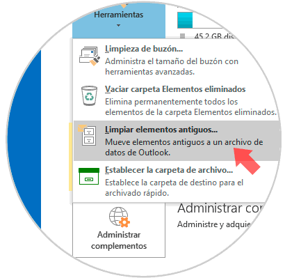 Para usar este proceso nos dirigimos a la ficha Archivo y desplegamos las opciones de Herramientas donde seleccionaremos la opción Limpiar elementos antiguos: