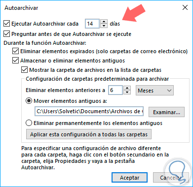 Se desplegará la siguiente ventana donde por defecto la opción “Ejecutar autoarchivar cada” se encuentra inactiva, procedemos a activarla y veremos las múltiples opciones: