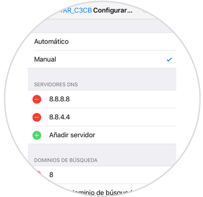 Pulsamos en la opción Configurar DNS. Y seleccionamos Manual para poder nosotros añadir o quitar los servidores DNS que queramos. En este ejemplo hemos puesto 8.8.8.8 y 8.8.4.4 que son los oficiales de Google como ejemplo.