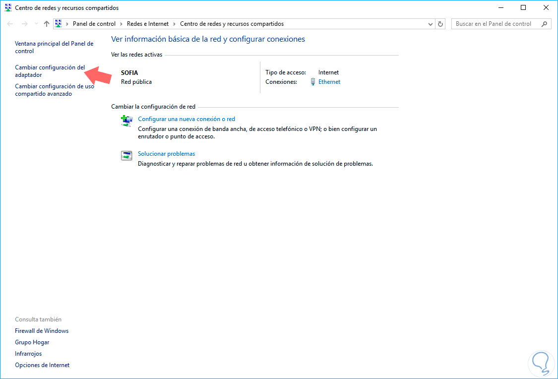 - Ir a la ruta Panel de control\ Redes e Internet\ Centro de redes y recursos compartidos.