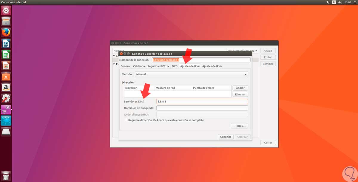 Finalmente nos dirigimos a la pestaña Ajustes de IPv4 y en el campo Servidores DNS agregaremos las respectivas direcciones IP del nuevo servidor DNS. Pulsamos en Guardar para aplicar los cambios.