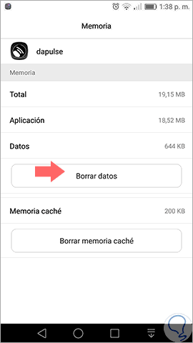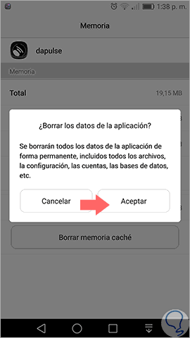 Aquí es necesario que pulsemos en el botón Borrar datos para eliminar toda la configuración actual de la aplicación y restablecer sus valores. Se desplegará el siguiente mensaje. Allí pulsamos en Aceptar para ejecutar el proceso.