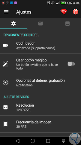 Una vez la grabación este completa vamos a los ajustes, o a la galería. y en la segunda pestaña veremos el video grabado: