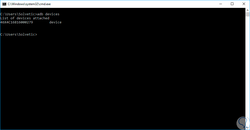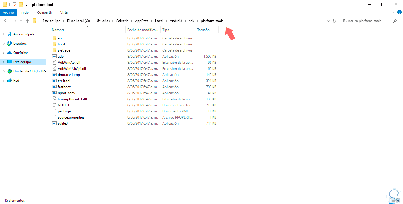 C:\Users\Solvetic\AppData\Local\Android\sdk\platform-tools (Reemplazamos Solvetic por el usuario respectivo), y veremos lo siguiente:
