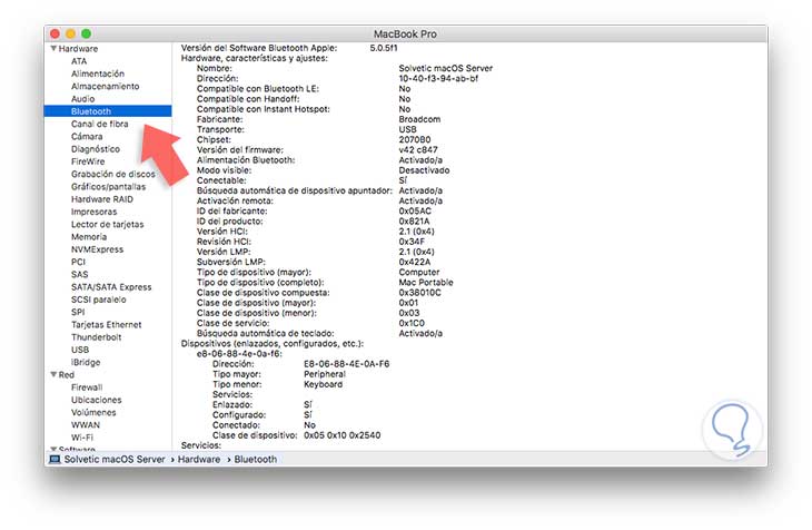 Esto desplegará un resumen completo con todos los componentes del sistema a nivel de hardware y software, allí buscaremos la línea Bluetooth. Como vemos contamos con el dispositivo Bluetooth listo para su uso.