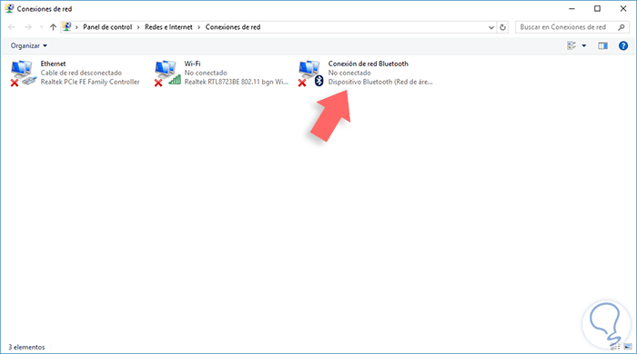 En Windows otra de las posibilidades para comprobar si contamos o no con Bluetooth es dirigiéndonos al Centro de redes y recursos compartidos y allí pulsar en la opción Cambiar configuración del adaptador ubicada en el costado izquierdo y allí veremos el adaptador Bluetooth disponible: