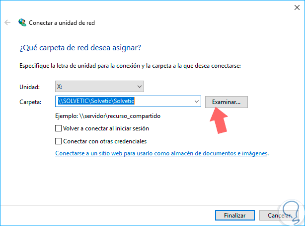 En la ventana desplegada asignamos la letra de la unidad de red y su respectiva ruta de acceso: