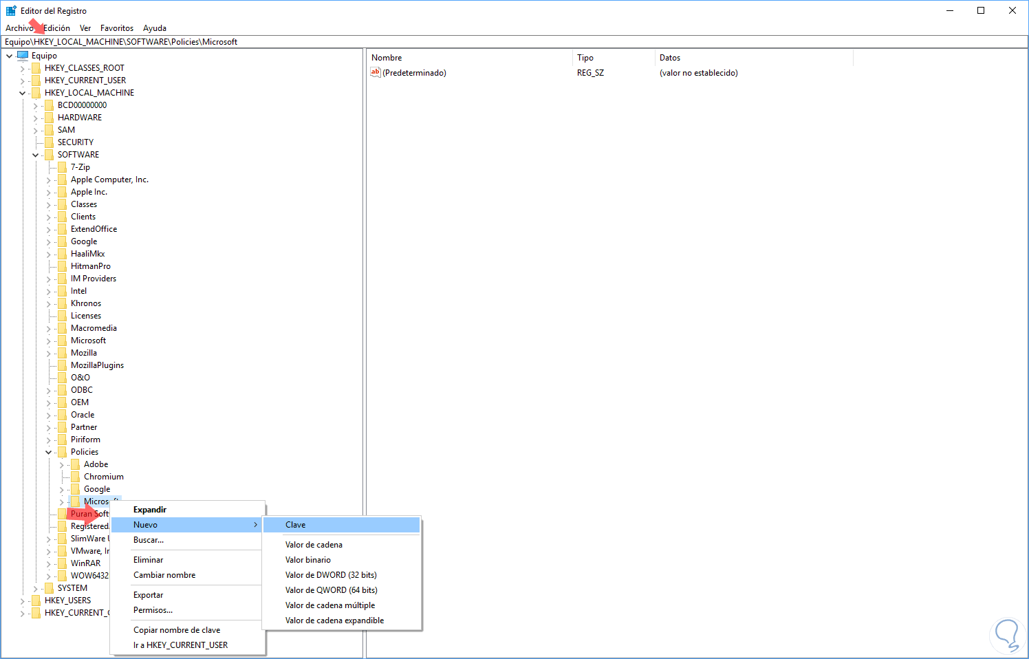 HKEY_LOCAL_MACHINE\SOFTWARE\Policies\MicrosoftAllí será necesario crear una nueva clave dentro de la carpeta Microsoft.Para ello daremos clic derecho sobre esta carpeta y seleccionamos la opción